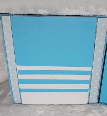 Verder heb ik een soort omklapvenster gemaakt en om die te kunnen openen heb ik hem beplakt met koningsblauw shining organza 15mm. Het venster heb ik gemaakt met een stuk mica, zodat er een foto van 10x15 cm in kan.